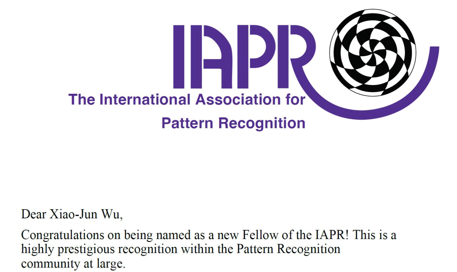 吴小俊教授当选国际模式识别学会会士