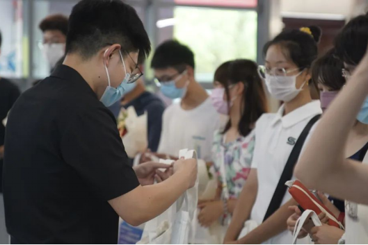 向老师们献花之后,紧接着就是领导与老师们向同学们赠送伴手礼环节,一个个精美的手提袋,装有裹满祝福的月饼,印上国产传媒