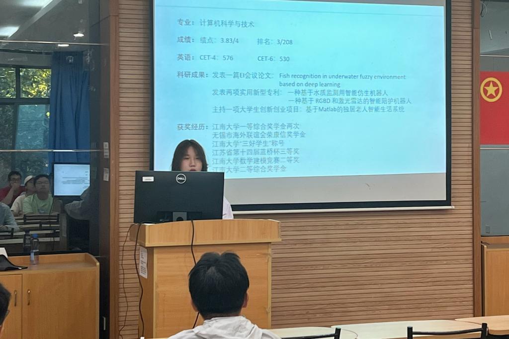 随后,保研至浙江大学工业工程设计专业的马佳芮同学作分享。她以个人经历为切入点,建议同学们在大学学习中要树立理想和现实两个目标,在追求进步的过程中要保持乐观的心态,并且要在能力所及的范围之内尽可能去争取发展机会。她为同学们梳理了数字媒体技术专业本科期间可以参加的主要科创竞赛项目并给出了明晰的努力方向。